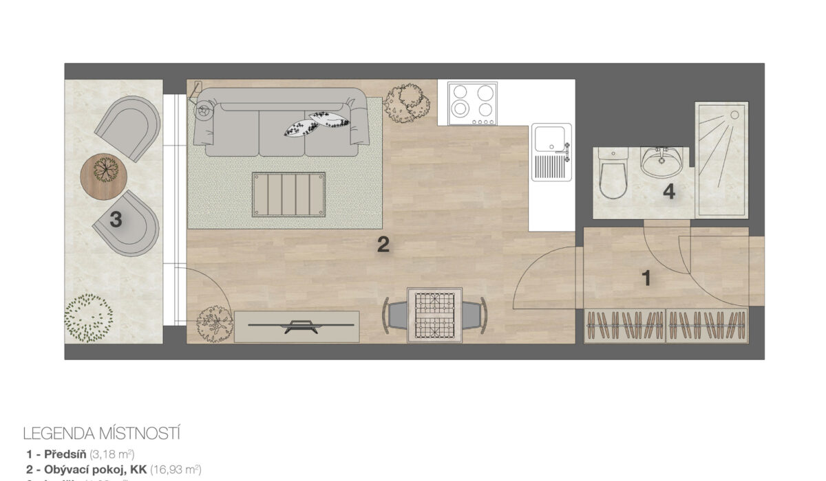 V bytě je prostorná chodba s vestavěnými skříněmi, pokoj s kuchyňskou linkou (s myčkou, pračkou, el. troubou a varnou deskou) a zděná koupelna se sprchovým koutem. Z pokoje je východ na zasklenou lodžii s nádherným výhledem do zeleně. K bytu není sklep ani komora.
