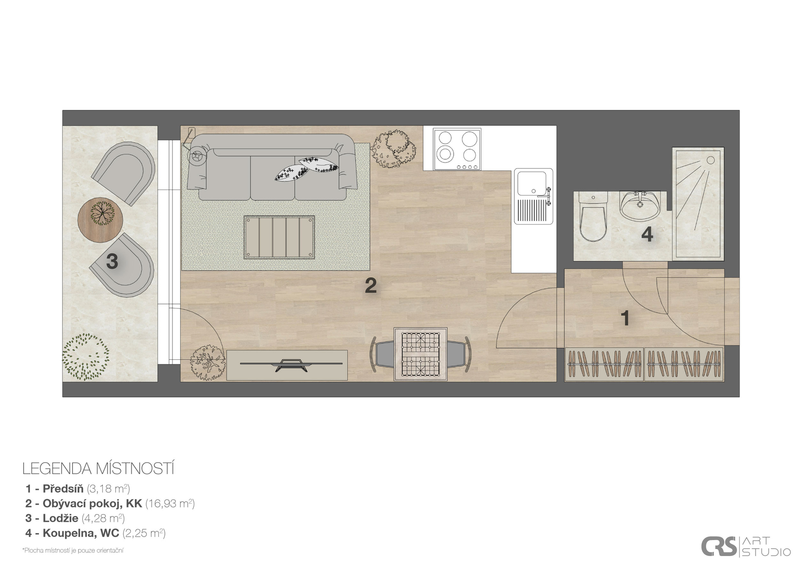 23m2, 9. nadzemní podlaží s výtahem, lodžie 3m2