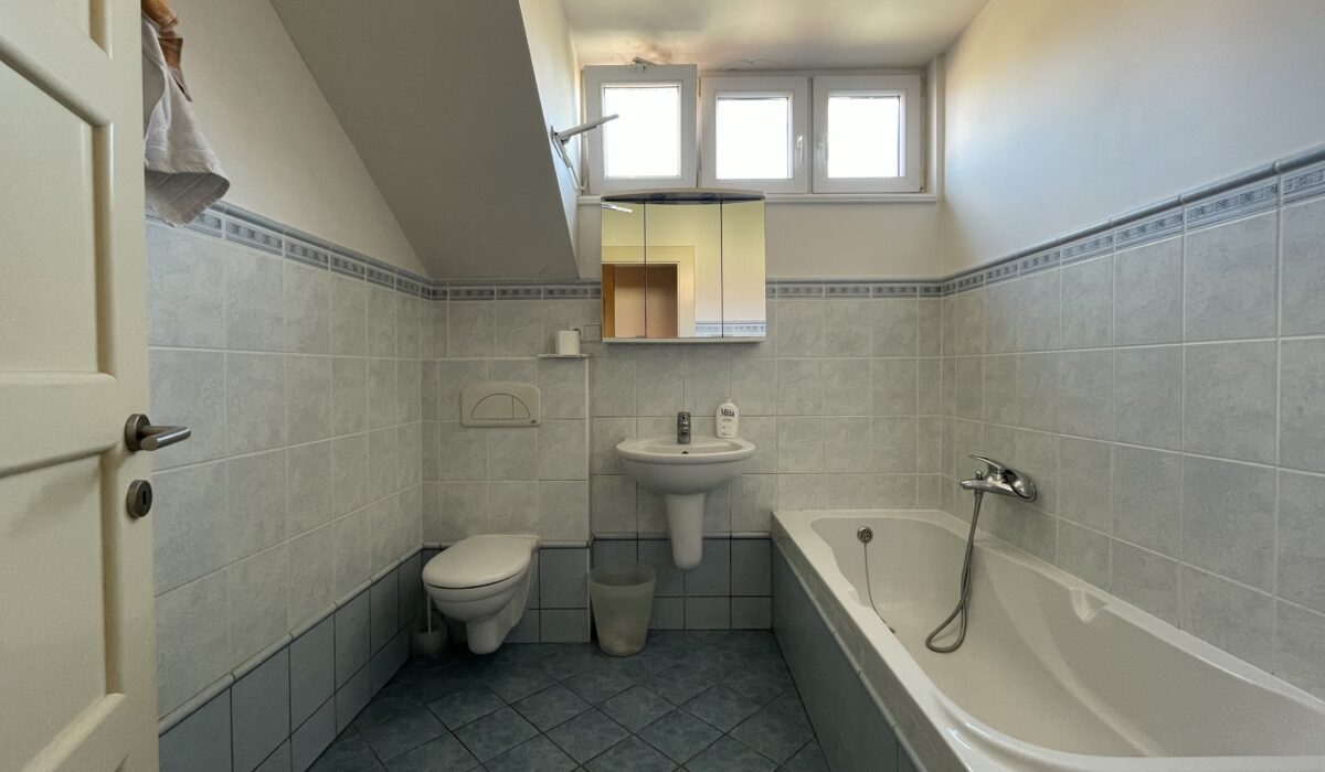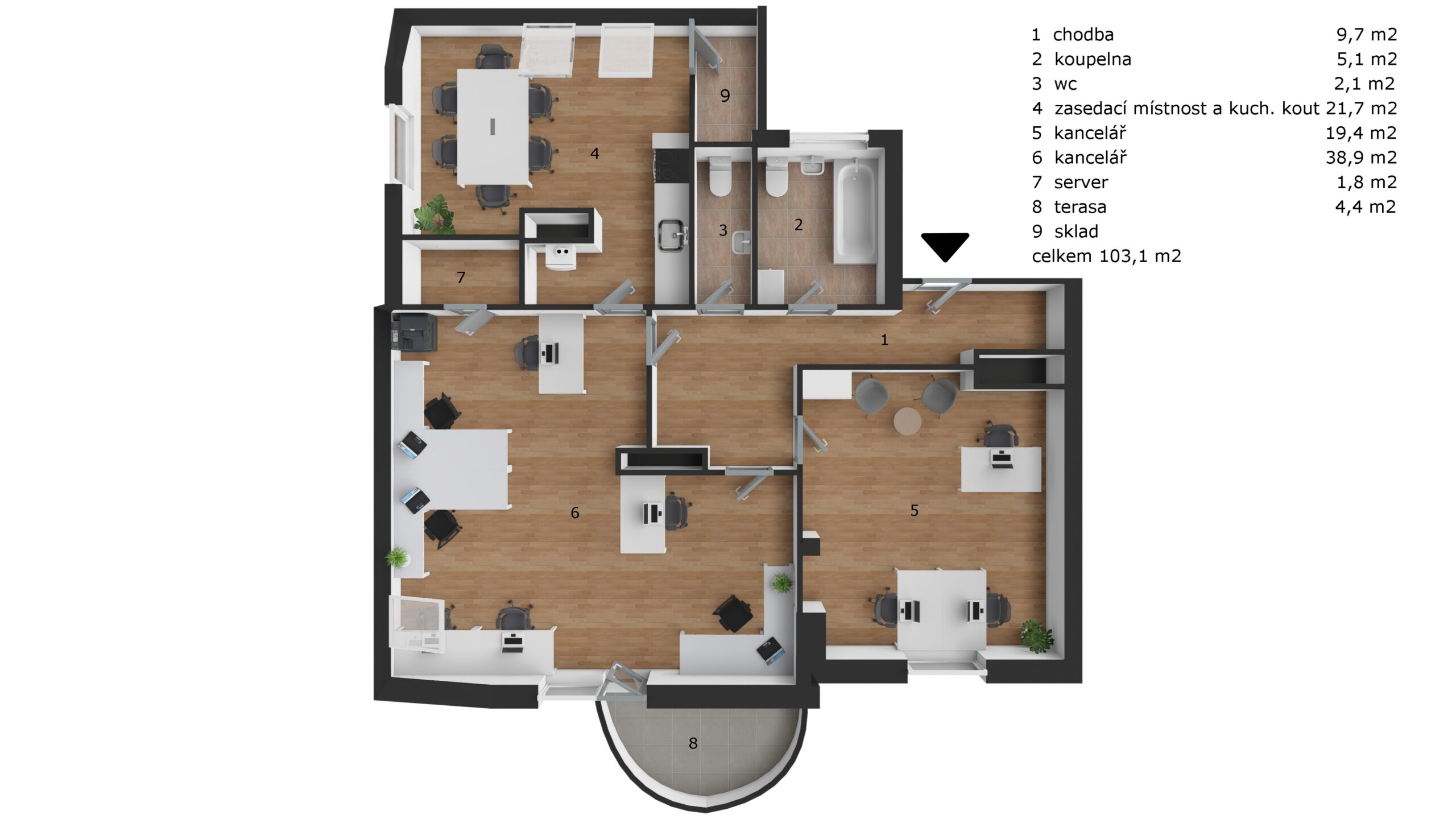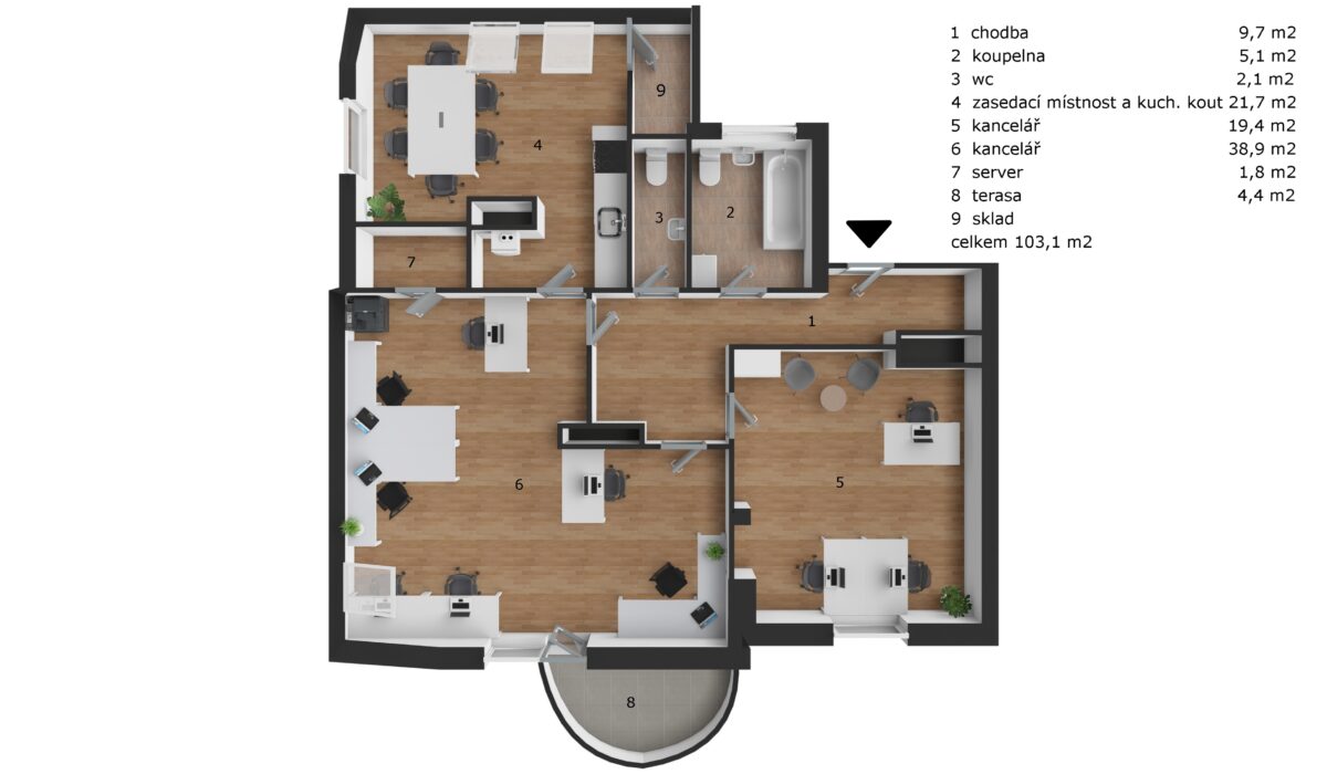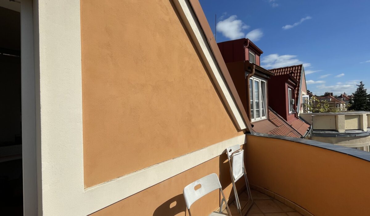 Jedná se o bytovou jednotku 3kk, která je nabízena výhradně jako kancelářský prostor sestávající ze 3 místností – 2 samostatných kanceláří a další místnosti s kuchyňským koutem, která je stávajícím nájemníkem užívána jako zasedací místnost. Jedna z kanceláří je průchozí se vstupem na balkon s pěkným výhledem do zahrady a dále směrem k ulici Evropská. Koupelna je s vanou a toaletou, k dispozici je pak ještě další samostatná toaleta. V chodbě je menší vestavná šatní skříň, velmi praktické jsou i 2 menší skladovací prostory/kumbály přístupné ze zasedací místnosti a další skladový prostor/sklep v suterénu domu.