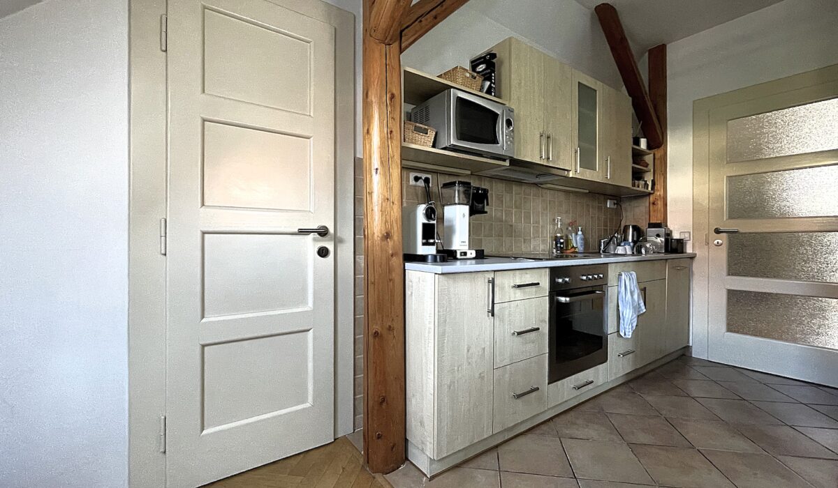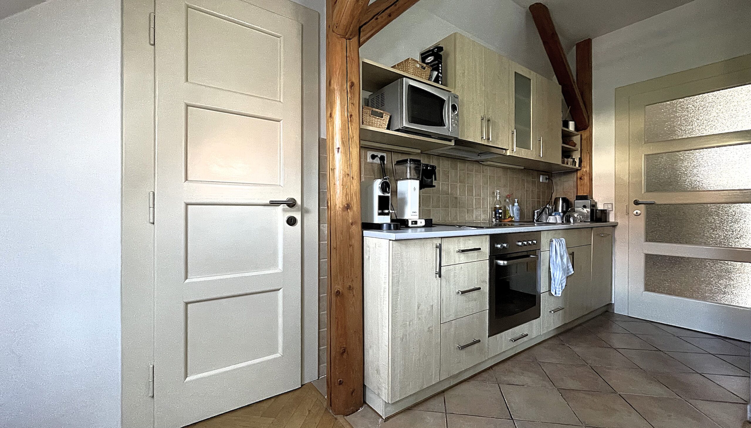 Kuchyňský kout je vybaven elektrickým sporákem, sklokeramickou deskou, myčkou, mikrovlnou troubou a samostatně stojící lednicí. Vytápění a ohřev vody zajišťuje vlastní plynový kotel.