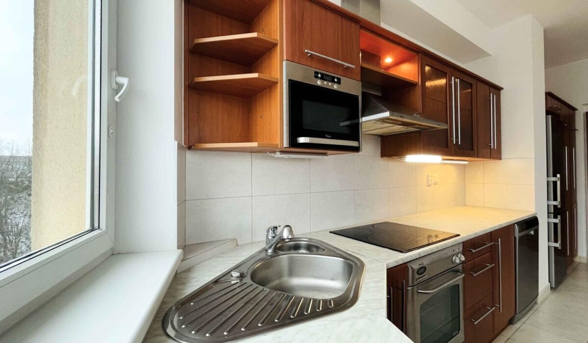 kuchyňský kout je plně vybaven vestavnými elektrospotřebiči (myčka, elektrická trouba a indukční varná deska, lednice s mrazákem, digestoř, mikrovlná trouba), disponuje dostatkem úložných prostor, jižně orientované okno s výhledem do zeleně