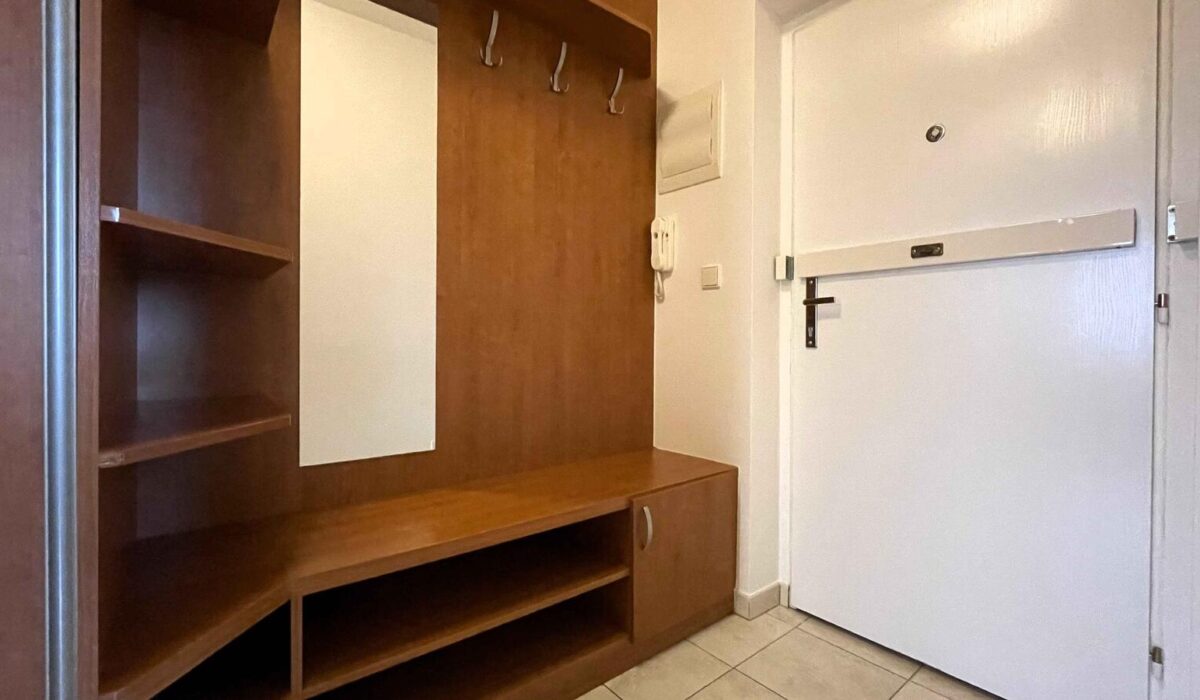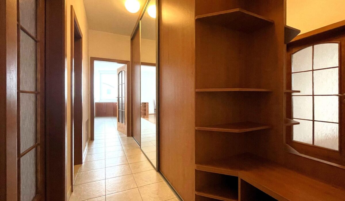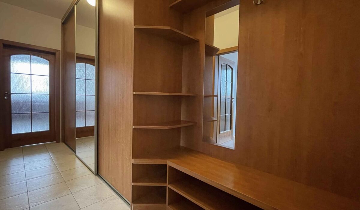– vstupní chodba je prostorná, vybavená třímetrovou vestavnou skříní a předsíňovou stěnou se sezením