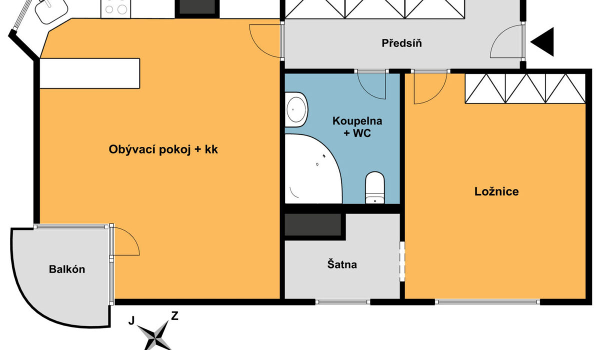 Dispozici bytu tvoří obývací pokoj s kuchyňským koutem a jídelním koutem, ložnice, šatna, koupelna s toaletou, balkon a sklep.