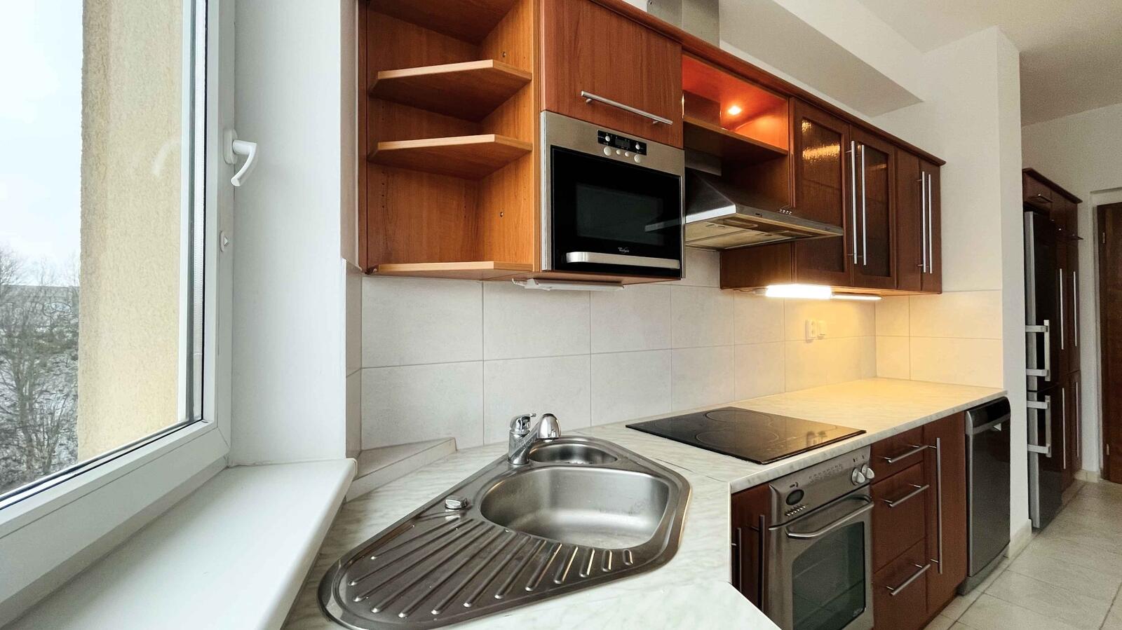 kuchyňský kout je plně vybaven vestavnými elektrospotřebiči (myčka, elektrická trouba a indukční varná deska, lednice s mrazákem, digestoř, mikrovlná trouba), disponuje dostatkem úložných prostor, jižně orientované okno s výhledem do zeleně
